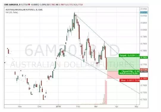 ?挂单买入澳元2018年6月份到期期货合约(芝商所合约代码6AM8)。