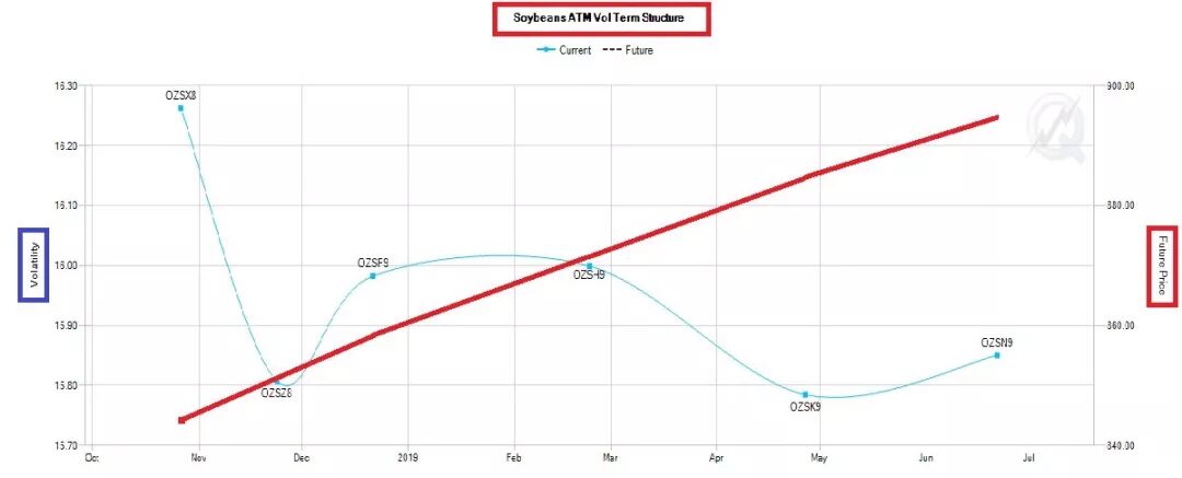 根据下面的QuikStrike风险管理平台,我们也可以看到芝加哥商品交易所大豆短期期权隐含波动率远远高于大豆长期期权期权隐含波动率(图中蓝线)。