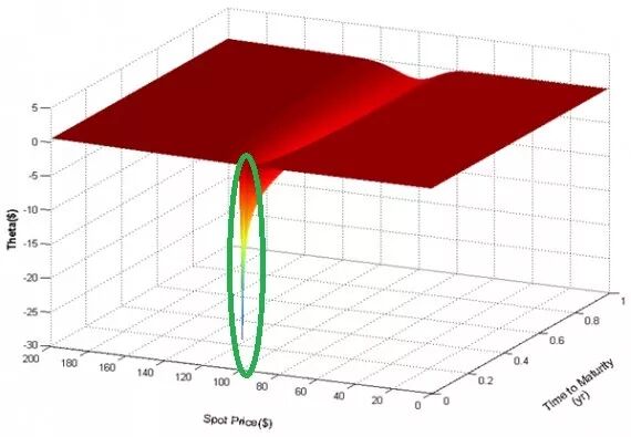 超短期期权——每周期权,除了价格相对便宜之外,从希腊值的角度来讲,它是一种High Theta期权。也就是说,期权的保险费的时间价值,在最后的两个星期流失的速度为最快。请看下面这一张图(图中的绿线内)。