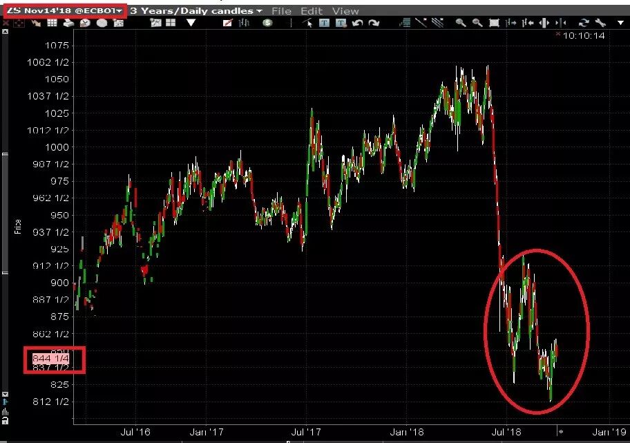 下面这张图是芝加哥商品交易所大豆(ZS) 十一月份期货的日线图,可以看出,目前大豆价格市场从五月份的高点已经下跌了将近20%,严重超卖。 (请看下面一张图)