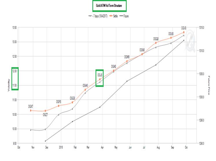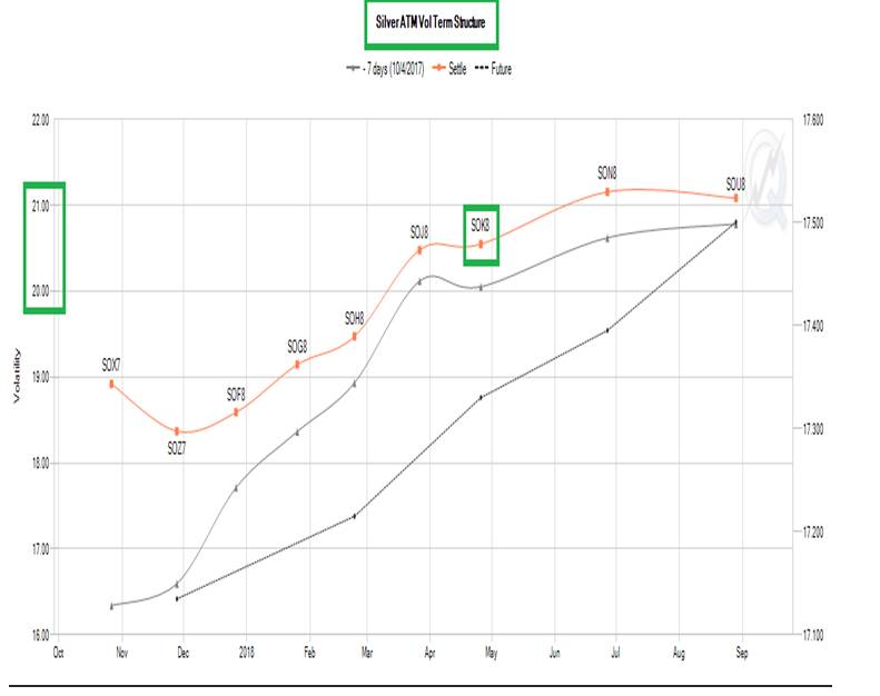 具体做法是: 买入2018年5月芝加哥商品交易所白银期权(SO)协定价格为17美元的跨式套利,同时卖出黄金期权(GO) 2018年4月协定价格为1285美元跨式套利。黄金和白银期权的隐含波动率分别显示在下面的两张芝加哥商品交易所Quik Strike期权风险管理平台截屏中。