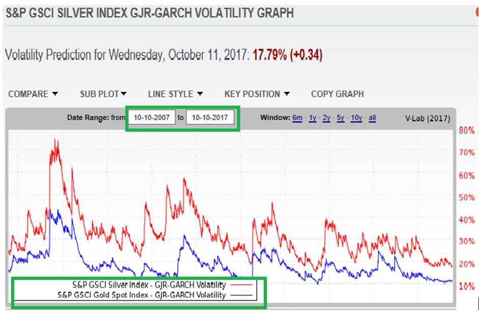 数据显示, 黄金白银过去10年的历史波动率差是在8%至25%之间移动。而目前的黄金,白银期权隐含波动率价差是在历史的最低点 (请看下面一张图) 这种现象是否为我们创造了一个黄金,白银波动率套利的机会? 也就是说,是否可以买入白银期权(SO)隐含波动率,同时卖出黄金期权(OG)隐含波动率?