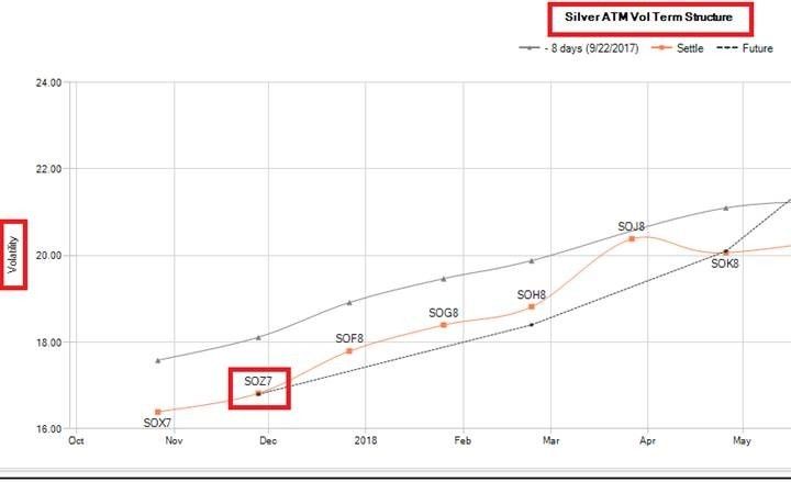 下面第二张图是不同月份白银平值期权隐含波动率比较图. 我们可以看到短期白银期权目前的隐含波动率比较长期白银期权隐含波动率来说比较低。