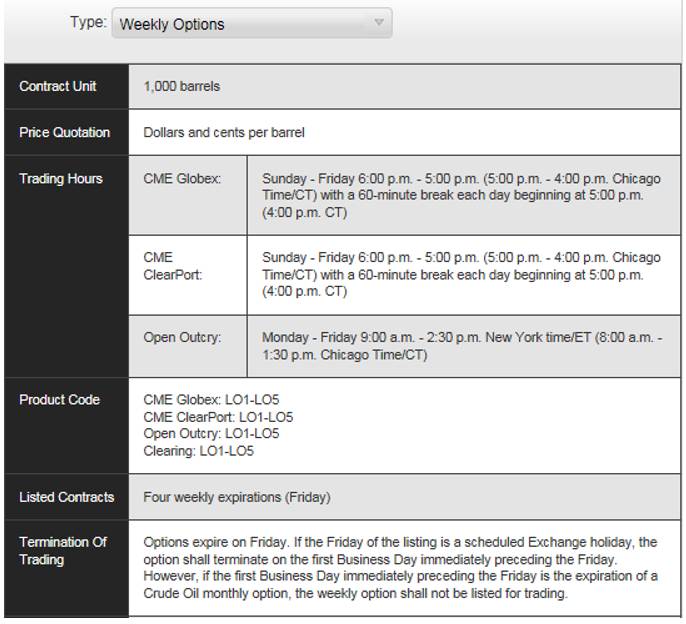 期权是人类有史以来创造的最精密的金融投资工具, 在芝商所, 有多种和WTI原油相关的普通期权(Plain Vanilla Options)和奇异期权( Exotic Options). 但从仅仅对冲上海原油期货时间段的风险这一角度来讲,也就是说用最少的费用来保护不到24小时的头寸风险这一角度来讲,超短期期权——WTI原油每周期权( 交易代码:LO1 - LO5)可能是最好的选择。因为从期权买方的角度来看, 毫无疑问购买每周期权所需付的保险费(Premium) 要比购买标准期权(从绝对价值来讲)低得多。