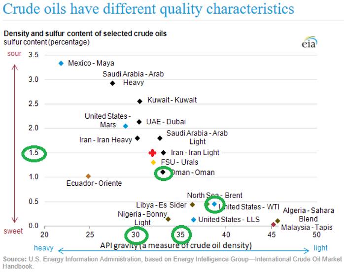 第一,从上海原油期货要交接的原油含硫量和比重来讲,可以这样说,上海原油期货和迪拜商品交易所(DME)的阿曼原油期货(OQD) 基本是同一产品离岸价格和到岸价格的关系。(请看下面的一张图, 图中的红点代表上海原油期货的在整个世界原油现货中的含硫量和比重关系图中的位置)。