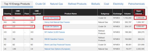 芝商所(CME Group)是一个拥有 170 年历史的,世界上最大、最安全的衍生品交易所。芝商所WTI原油期货期权的未平仓合约总和超过了500万手(请看下面一张图)。世界上其他交易所的原油期货期权的未平仓合约总数与芝加哥商品交易所的相比,根本就不在一个档次上。