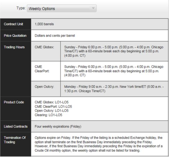 在芝商所, 有多种和WTI原油相关的普通期权(PlainVanilla Options)和 奇异期权( Exotic Options)。和我们今天的策略有直接关系的,是两个最常用的WTI原油期权:一个是标准期权,即每月期权;一个是超短期期权,即每周期权。