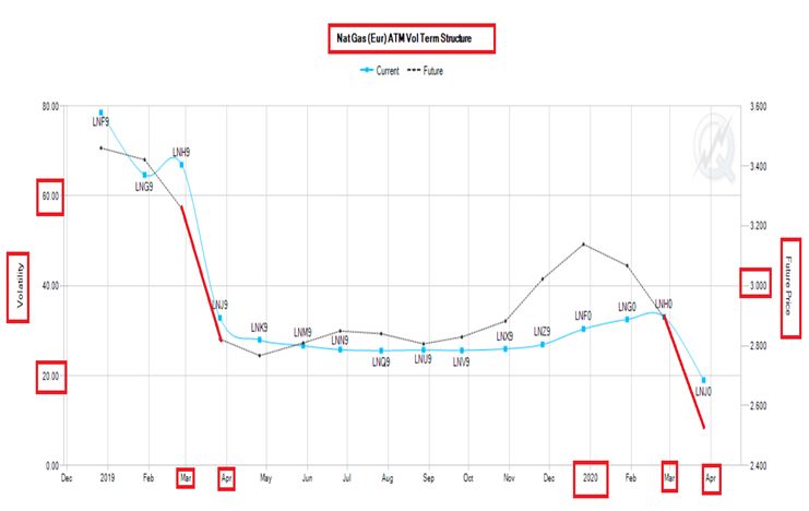 芝商所的天然气( Henry Hub)衍生品,无论从每日的交易量或者从未平仓合约来说,都是世界上最大的天然气衍生品产品。天然气期货期权价格变动,具有强烈的季节性。在每年供暖季节的时候,价格的变化就更为剧烈。特别是三月份和四月份天然气期货的价差交易被人们称之为“寡妇制造者”(Widowmaker)价差交易(请看下面第一张图的红线),意思是说如果在三月份和四月份价差交易中做错了方向,结果很可能就是倾家荡产。