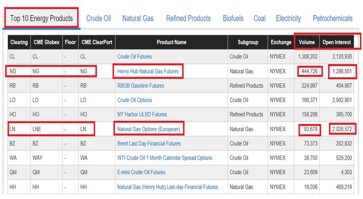 芝商所的天然气欧式期权(LNE)无论是从每天的交易量或者是从未平仓合约来看,都是在芝商所的能源衍生品产品中名列前茅(请看下面一张图)。天然气欧式期权的良好的流通性,为我们提供了一个活跃的交易场所。