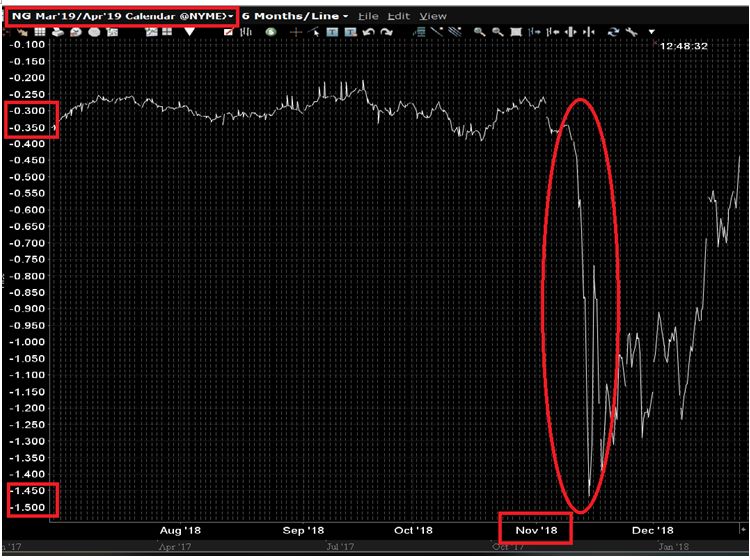 这是因为三月份是美国天然气冬季供暖的最后一个月份,而四月份是美国天然气补充库存的季节开始。这两个月份的价差平时在入冬之前只是四月份贴水30美分左右,但是很多初入天然气市场的交易员总是认为这个价差远远超过了其他月份的价差,所以就大胆的做“反套”: 卖三月买四月,这就是著名的“寡妇制造者”价差交易头寸。而如果在冬季突然发生了超出市场预测的气候剧烈变化,天然气冬季消费月份的三月和库存补充的四月之间的价差就会大幅度地增加。这种事情在过去经常发生,最近一次就是发生在去年11月初,一场突然到来的寒流造成了整个冬季月份(一、二、三月)的天然气期货井喷式的爆破上升。但2019年四月份的价格没有太大的变动。2019年三月和四月天然气期货价差从平时的四月份贴水30美分,爆涨到四月份贴水1.45美元。所有做反套的(买四月卖三月)“寡妇制造者”价差交易头寸的交易员基本上全部爆仓,这就又一次证明了,天然气3月4月期货反套的高度危险性。(请看下面第二张图)