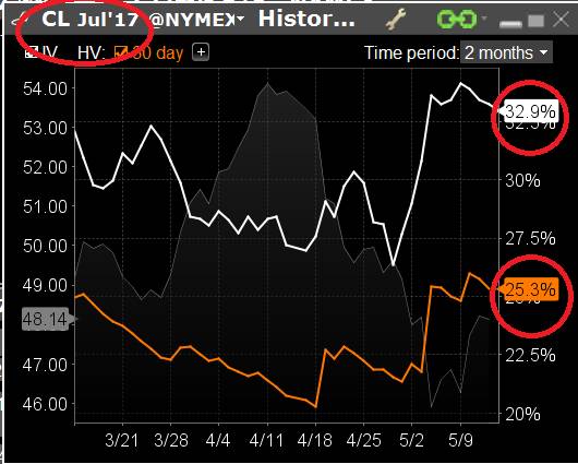 下面的这张图是芝加哥商品交易所6月17日到期的七月份 WTI 原油期权隐含波动率和历史波动率的比较图。图中白线所代表的隐含波动率已经远远高于历史波动率。期权市场的有效性已经被大大打了折扣。(附件3)