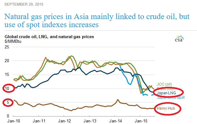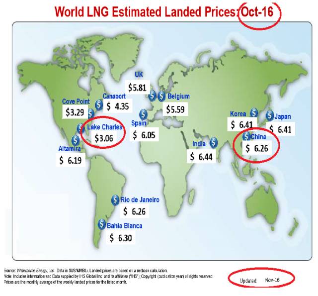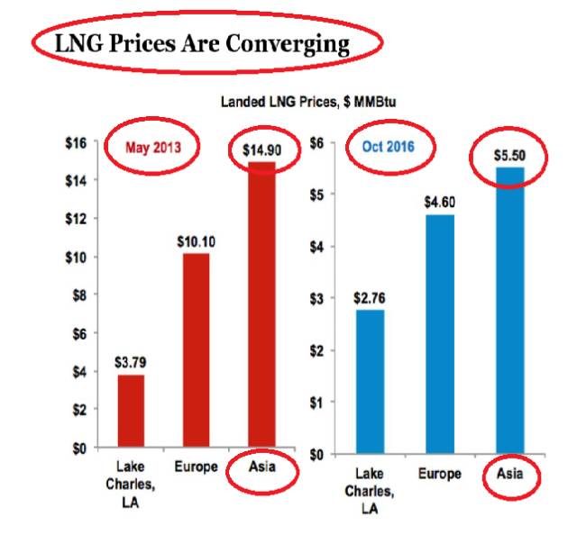 目前液化天然气已经变成了一个非常国际化的大宗商品。液化天然气(LNG)的亚洲价格正在急剧下降,不断地向美国液化天然气基本价格靠拢。 从2013年5月到2016年10月,亚洲液化天然气对美国路易斯安那州 LakeCharles 液化天然气的价差,已经从11美元降到了不到 3 美元。