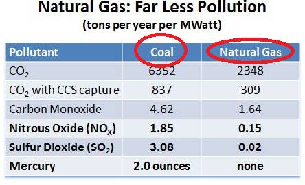 天然气发电的时候,天然气比其他碳氢化合物燃料(如石油和煤)燃烧得更干净,每单位释放的能量产生的二氧化碳更少。对于运输,燃烧天然气比燃烧石油产生的二氧化碳减少约30%。对于等量的热量,燃烧的天然气产生的二氧化碳比用于燃煤的煤约少45%。