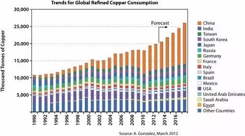 我国是世界上最大的铜使用国家,也是世界上最大的铜进口国。 (请看下面的一张图) 我国经济发展的速度,对世界精铜价格影响巨大。