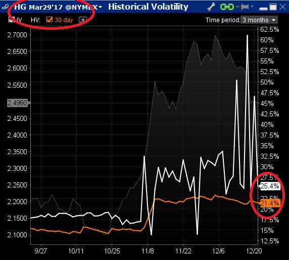 以芝加哥商品交易所明年3月精铜期货(HG) 价格为例。过去一个多月,精铜(HG) 3月份期货在2.45 至 2.7 美元之间震荡了一个多月。由于高利率的影响,2017年,特别是2017年的第二季度和第三季度,精铜价格冲破2.7美元或者跌破2.45美元的概率,几乎是一模一样的。